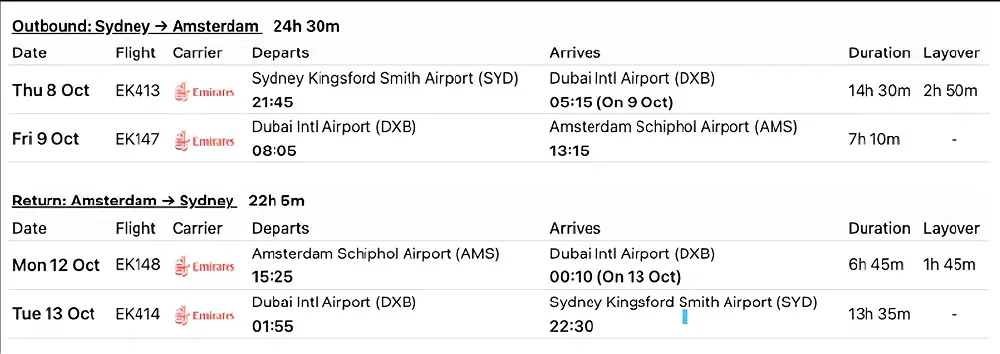 Return Date: 12/10/2026 (Arrive Sydney 13/10/2026)
